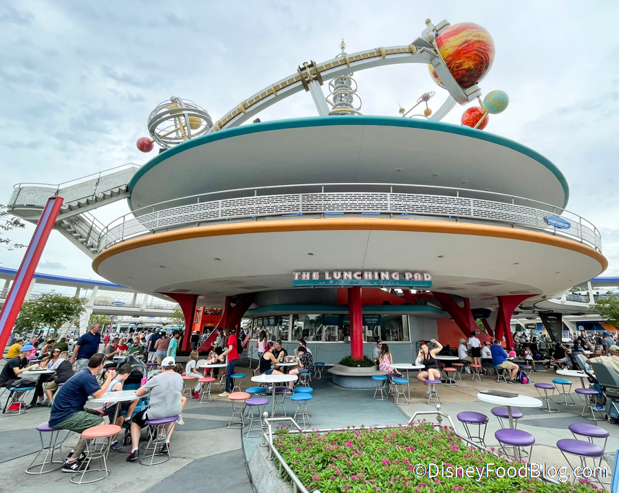We found this particular 50th anniversary snack at The Lunching Pad, which is a quick-service restaurant in Tomorrowland. This location does have mobile order. Here, you can typically grab some classics like a Cream Cheese Stuffed Pretzel, a slushy, or a hot dog, but today we were after something special.