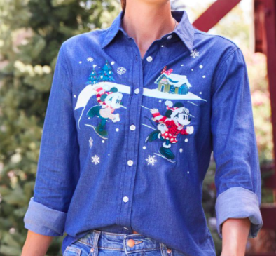 Or, if your home climate is a little warmer, there’s a collared denim shirt that has Mickey and Minnie ice skating on the front.