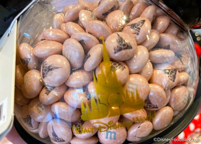 It’s such an unfortunate decision to go with that color. It seems like every other 50th Anniversary snack in Disney World was EARidescent with shades of blue, pink, and purple. That would have been perfect for M&M’s! But this time it had to be brains — er — champagne we mean.