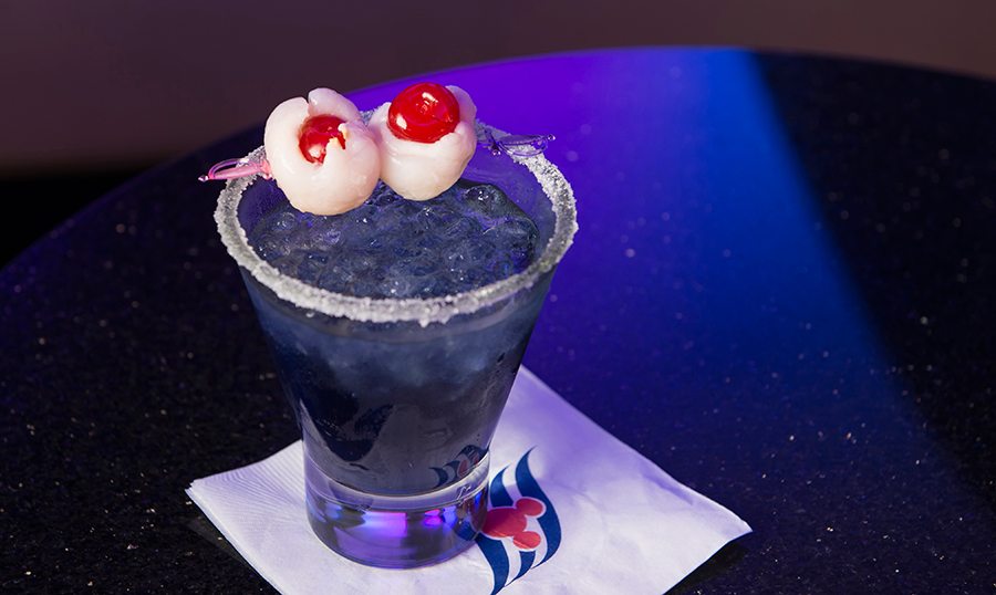 The Spooky Juice is a rum-based drink that looks like a straight-up potion with its purple color and creepy-cute lychee garnish!