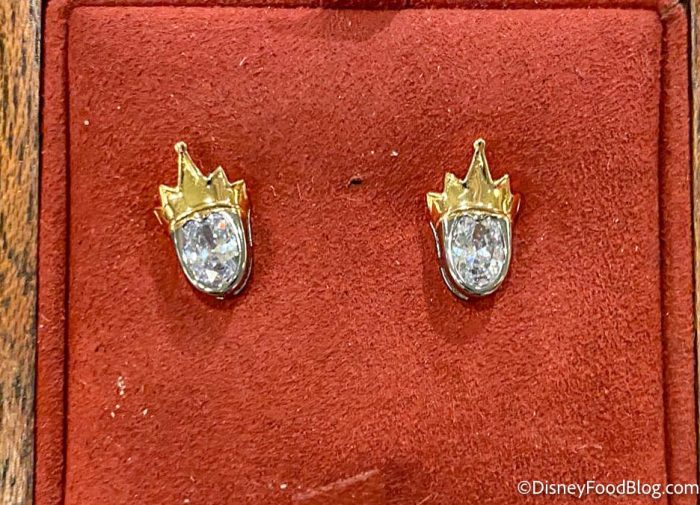 The Evil Queen earrings are made with cubic zirconia stones for the face, a black rhodium finish, and “topped with her iconic crown in 18k yellow gold.” They’re available online and in Disney World for $125.