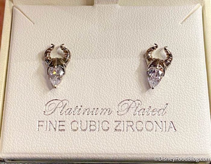 And finally, there are the Maleficent earrings, which are a little bit cheaper than the other two pairs at $100. These have cubic zirconium stones for the faces and black rhodium plating for the Mistress of All Evil’s horns.