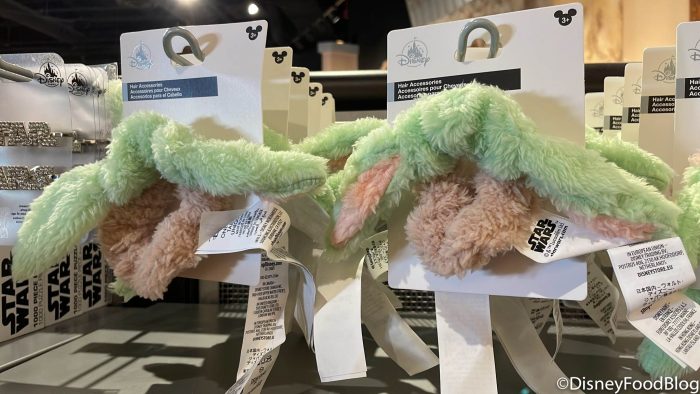 In Tatooine Traders, you can find a few different Baby Yoda themed accessories! In your hair, you can wear the Baby Yoda Hair Scrunchie for $14.99…