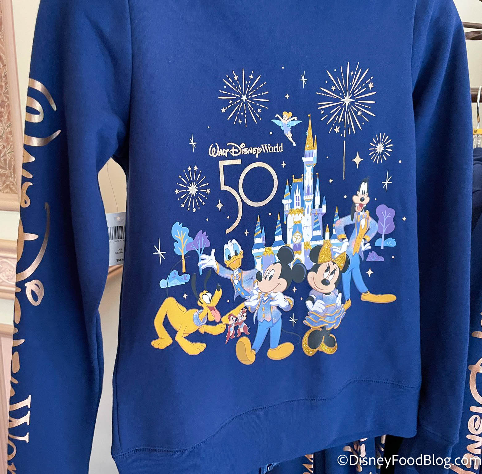 The back of the sweatshirt has the 50th anniversary art design we’ve seen on many 50th items, along with the Fab 5, and the sleeves have the gold Walt Disney World logo.