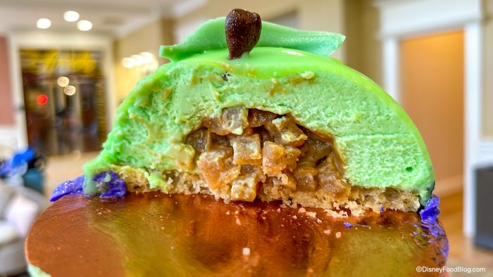 The most prominent flavor is the cinnamon sweetness of the cooked apples in the center! The applesauce cake is very moist, light, and subtle in its apple flavor. We’re actually kind of glad the violet flavor wasn’t particularly strong because we really enjoyed the applesauce cake and the cooked apples in the center! That being said, it would have been nice to be able to try that violet flavor.