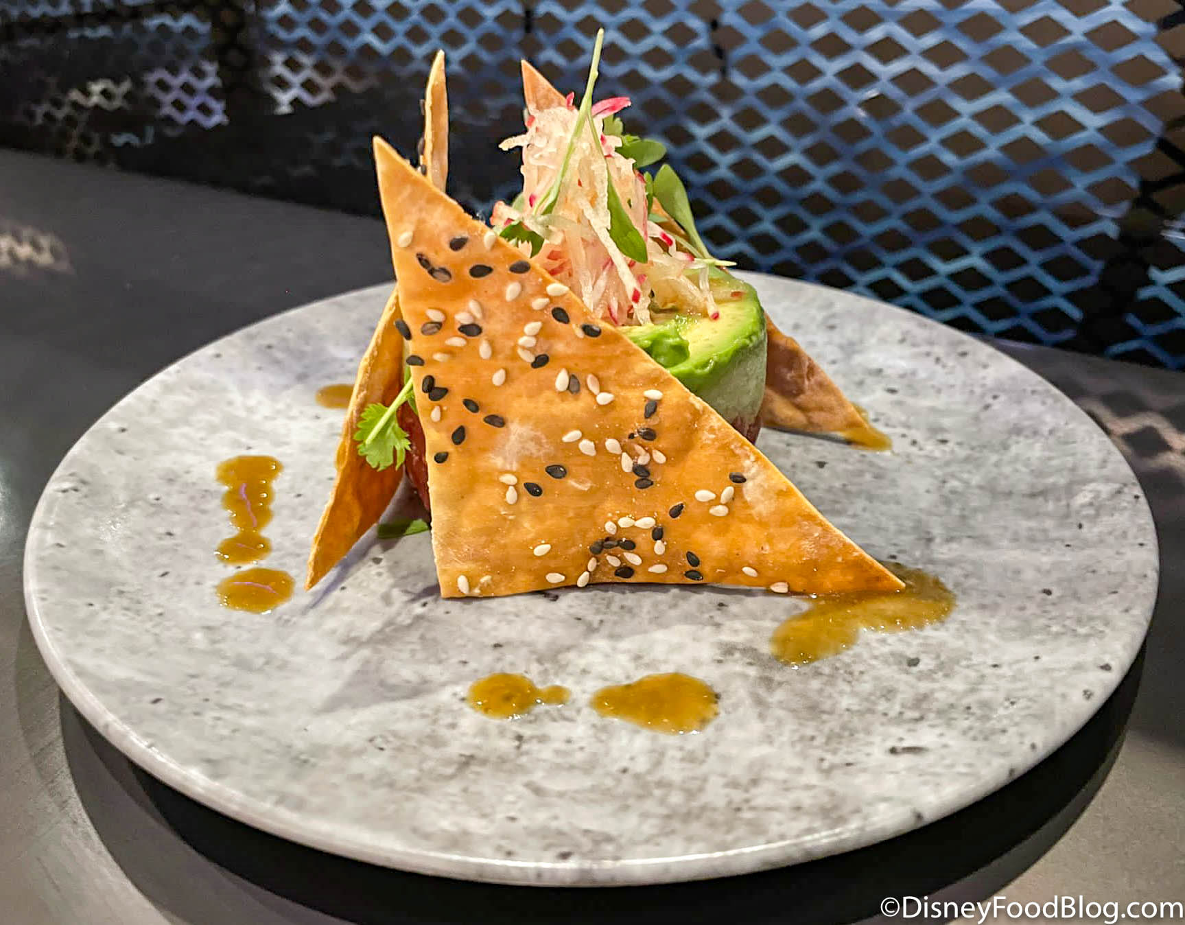 The Neptune Tartare is made with Yellowfin Tuna, Yuzu Ginger Miso, Soy, Avocado, Raddish, Apple, and Sesame Crackers.