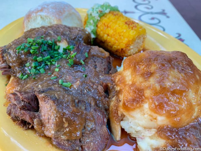 - Smothered Beef with mashed potatoes, seasonal vegetables, caramelized onions and roasted garlic au jus