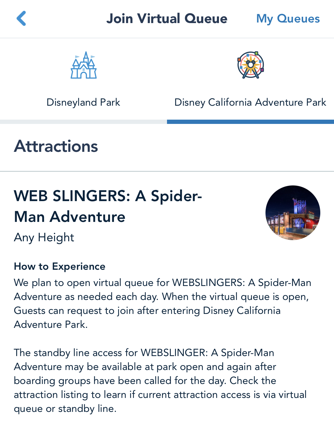 …while WEB SLINGERS was not. The “How to Experience” description explains this a bit further stating that “The standby line access for WEB SLINGER: A Spider-Man Adventure may be available at park open and again after boarding groups have been called for the day. Check the attraction listing to learn if current attraction access is via virtual queue or standby line.”