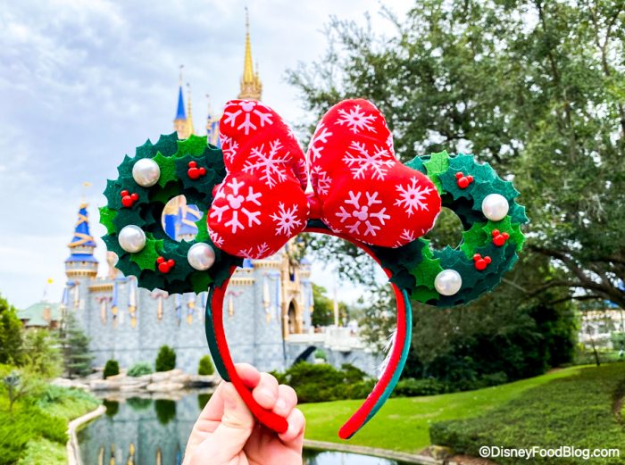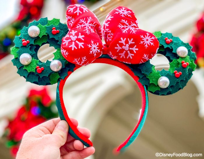 They have a red snowflake bow and the ears are two Christmas wreaths with little red Mickeys (that are definitely imitating holly)…