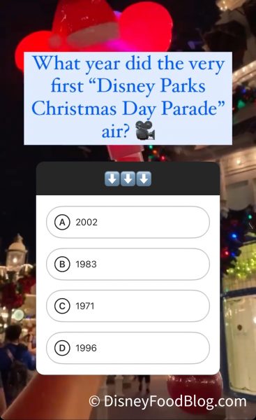 The final question in our holiday trivia game was, what year did the very first “Disney Parks Christmas Day Parade” air: 2002, 1983, 1971, or 1996?