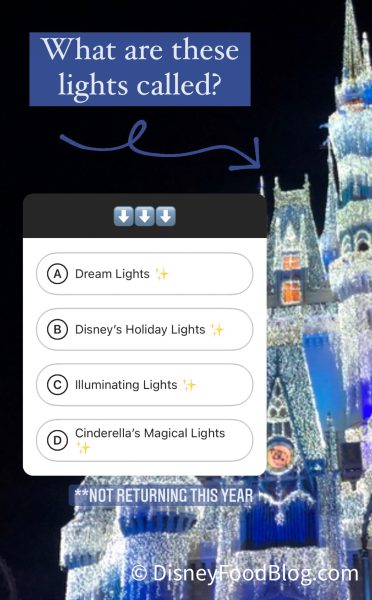 We then asked our followers if they knew what these lights shown below are called: Dream Lights, Disney’s Holiday Lights, Illuminating Lights, or Cinderella’s Magical Lights?
