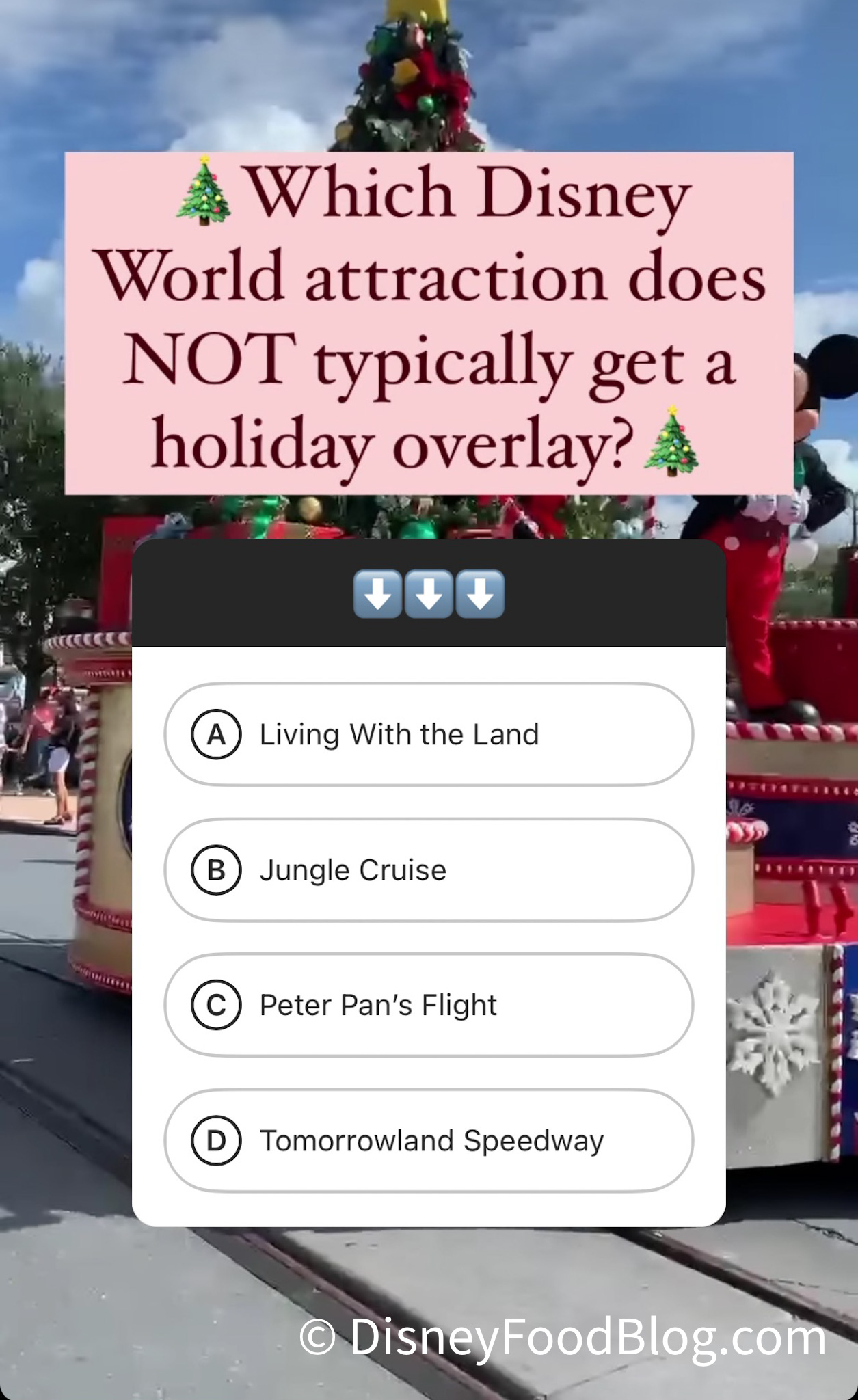 We asked which Disney World attraction does NOT typically get a holiday overlay: Living With the Land, Jungle Cruise, Peter Pan’s Flight, or Tomorrowland Speedway?