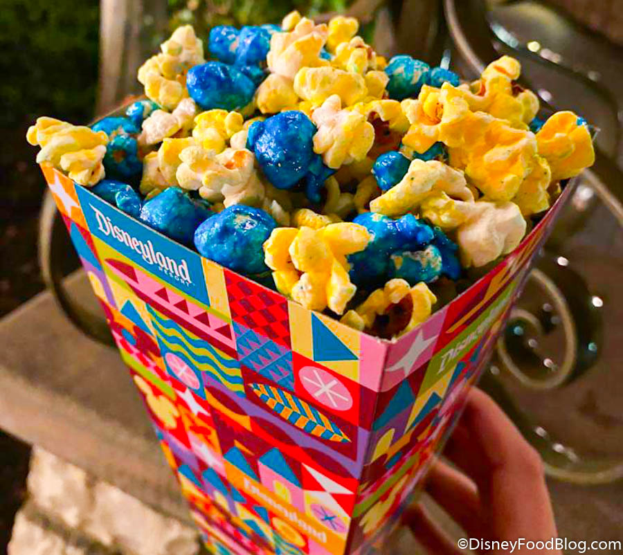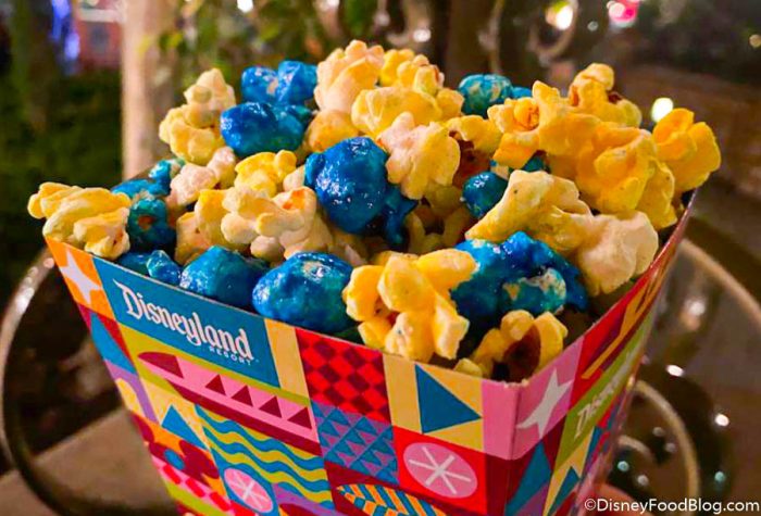 During last night’s party, we swung by one of the Disneyland Popcorn Carts to try out the Elsa Iced Popcorn Mix. Spoiler alert: There is no actual icing on this snack. We know, we know. We were disappointed too. We get it “iced” like “Elsa’s Ice Palace,” not “iced” like “icing on our popcorn.” It’s fine.