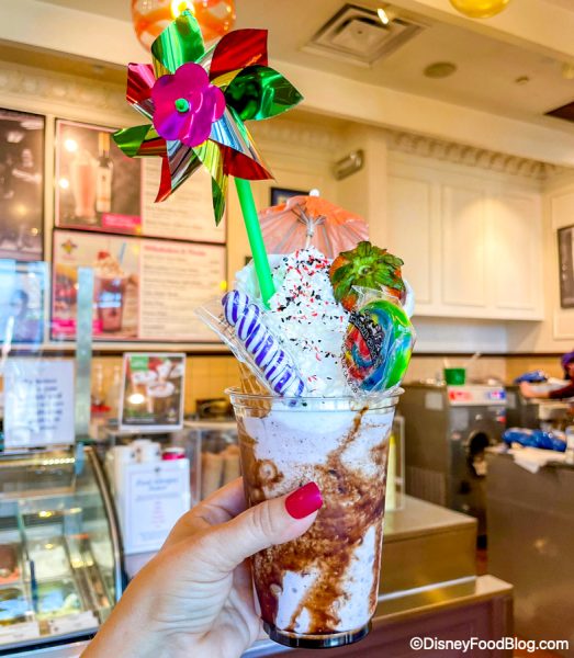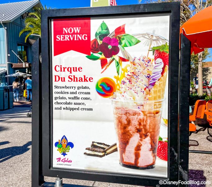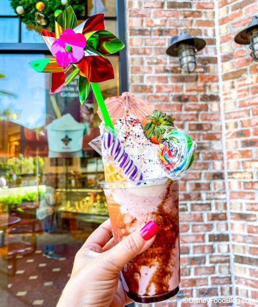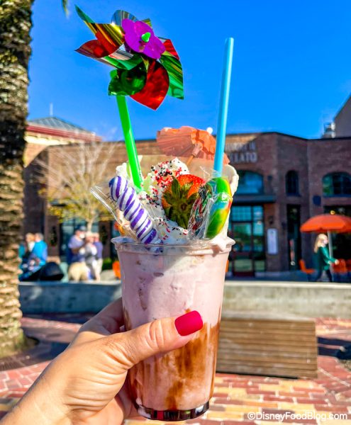 This is the Cirque Du Shake from Vivoli il Gelato in Disney Springs! It has strawberry gelato, cookies and cream gelato, a waffle cone that is half dipped in white chocolate and has gold shimmer dust, chocolate sauce, and whipped cream.
