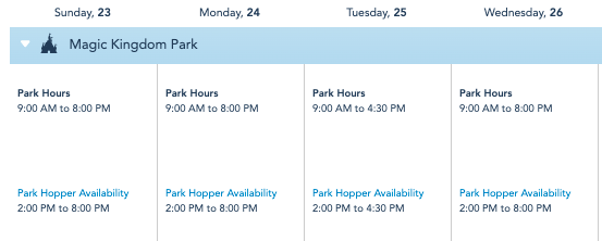 The Disney World parks have varying hours, so you want to keep an eye on the calendar and DFB’s updates so that you know how early you can enter the parks and how long you can plan to stay.