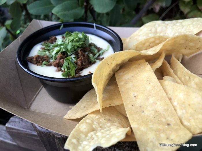 Creamy cheese + Impossible Chorizo to add a bit of flavor and a texture difference + house-made, wonderfully crunchy chips = deliciousness! You can get it for $7.