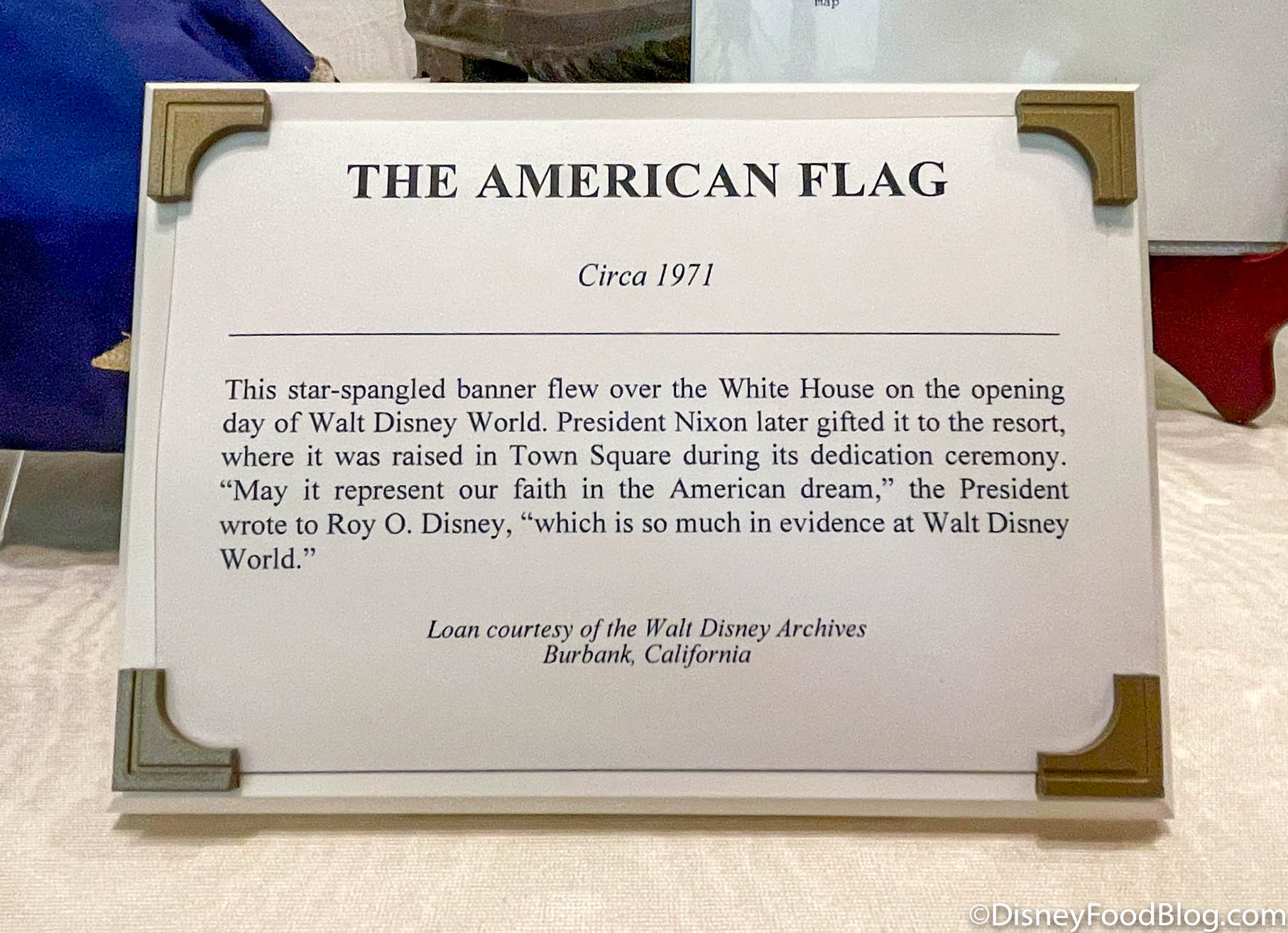 The piece you’ll be looking for is an American flag. What’s so special about this flag? Well, this flag played a special role in the opening of Walt Disney World in 1971. On October 1st, 1971, then-President Richard Nixon flew an American flag outside of the White House. He then packaged that flag and sent it to Roy O. Disney. It was used on Walt Disney World’s dedication day on October 25th, 1971.