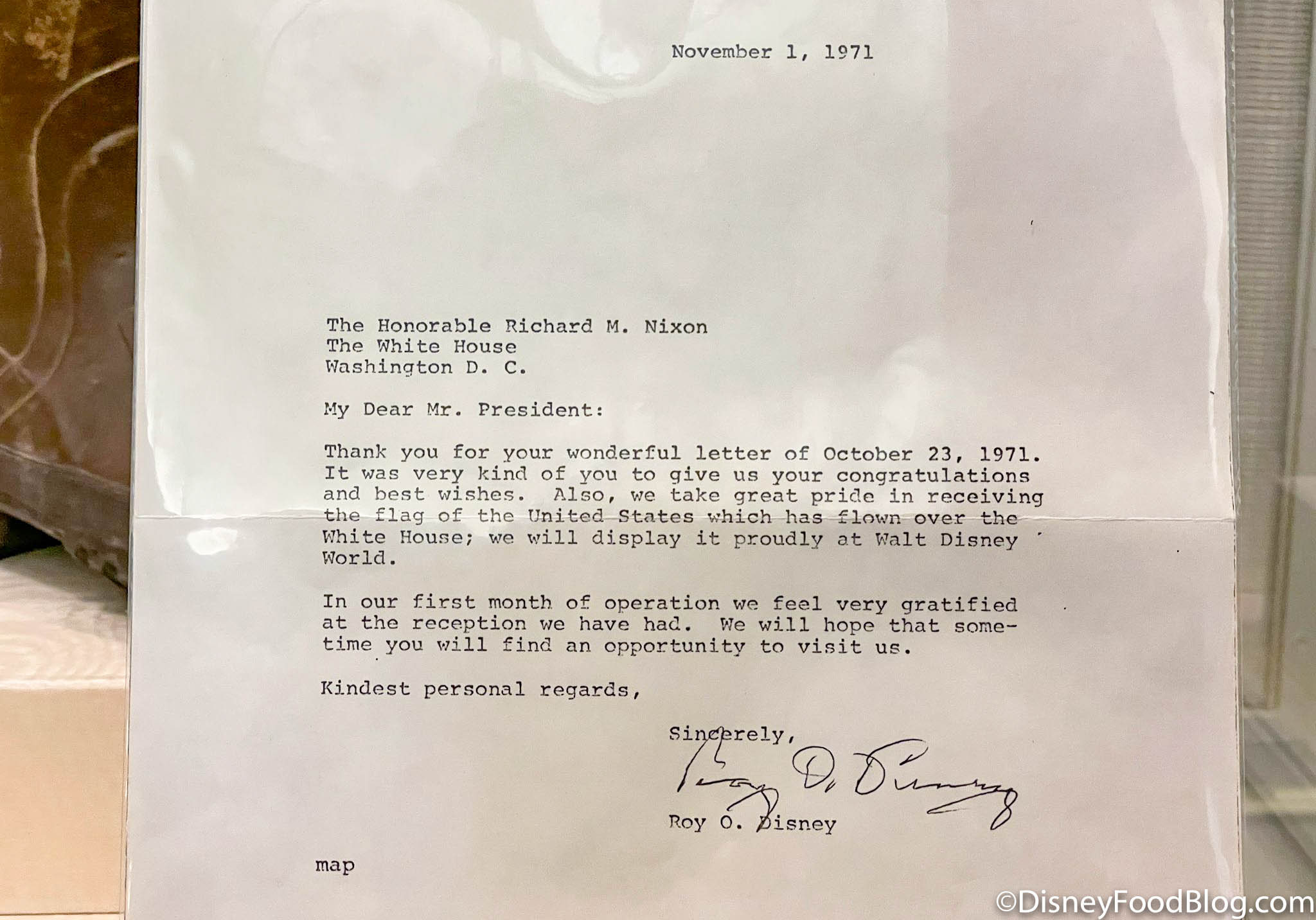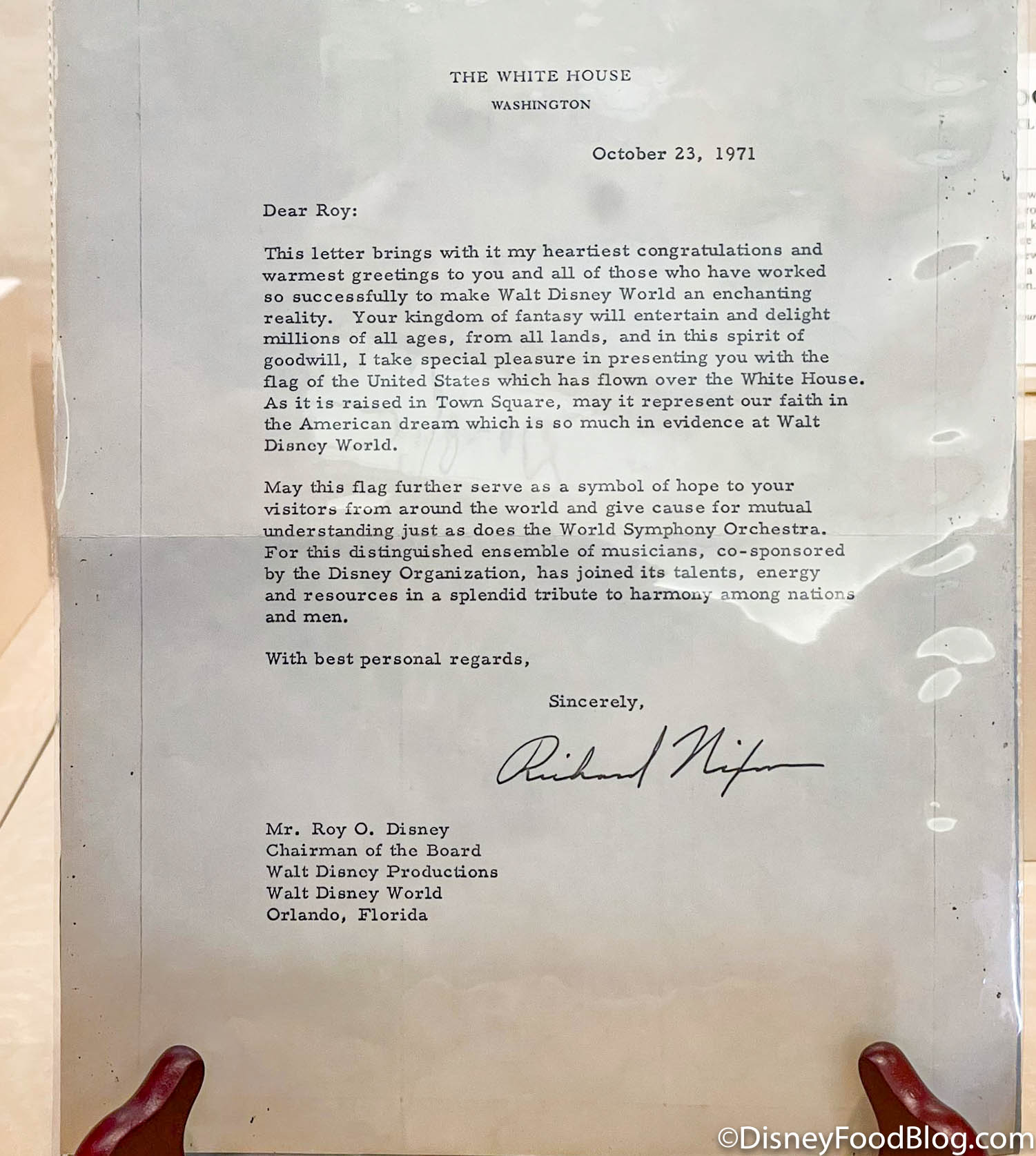 This is actually the first time a president has ever done that. When the dedication was over, Roy Disney had the flag folded up and it was sent to Dave Smith, who founded the Walt Disney Archives. Smith had the flag and the memos sent to and from Roy Disney and President Nixon stored away and there they sat for many years.