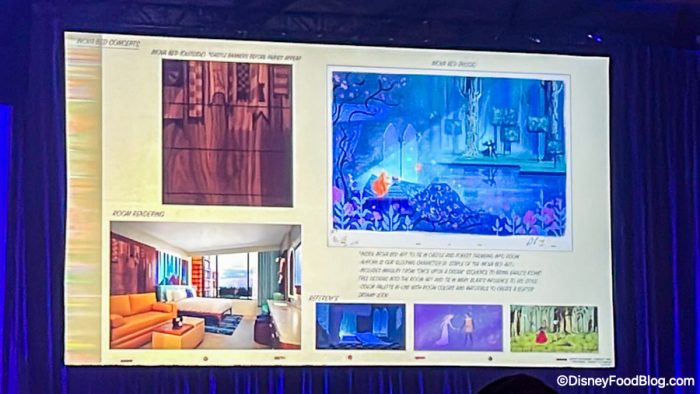 This room is inspired by the animated classic Sleeping Beauty, which takes colors from the movie and subtly surrounds you in the space. It’s designed to evoke the mood and emotion of the film! This is just one room in the new tower, so we can’t wait to see what other designs will be in the space.