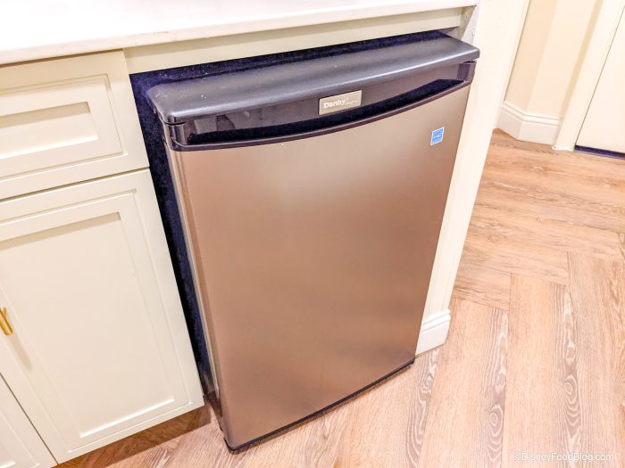 First, there’s a mini-fridge with a good amount of room for all your leftovers and snacks!