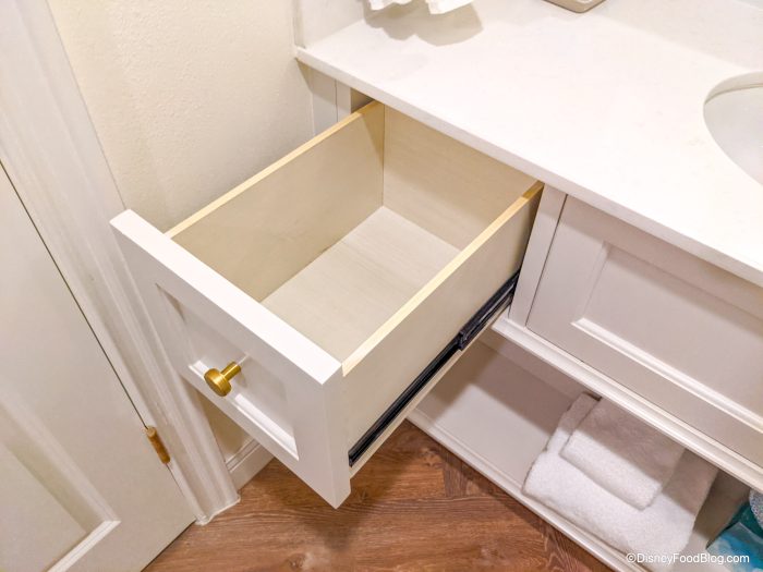 Underneath the vanity, you’ll find extra towels, tissues, and toilet paper.