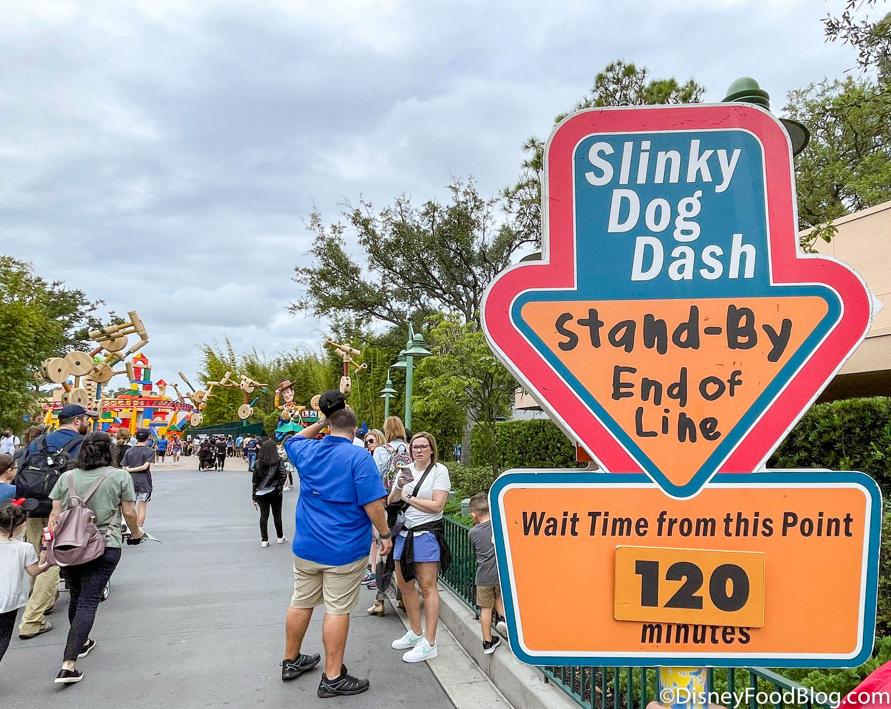 Some of the places where you’ll spot the biggest evidence of crowds will be at lines for spots to grab some food or the attraction queues. We spotted some particularly long lines for popular rides like Slinky Dog Dash in Hollywood Studios…