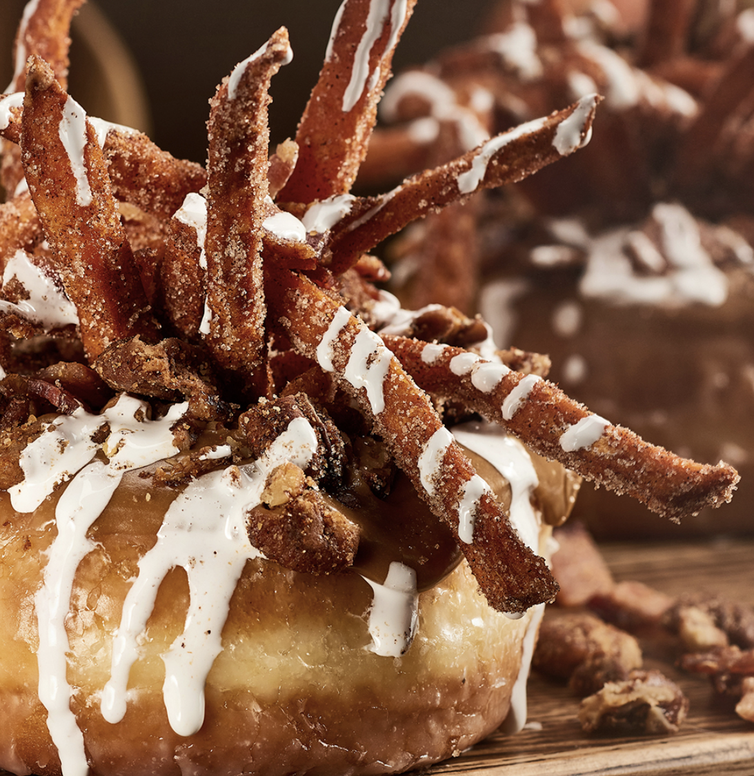 Uh, isn’t this thing crazy looking?! It has cinnamon-sugar dusted sweet potato fries, crunchy candied pecans, and sweet-salty bacon on a plump glazed donut that is finished with a marshmallow drizzle. There is a LOT going on here!