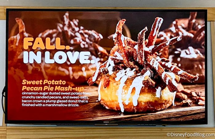 This is a big glazed donut that’s topped with cinnamon-sugar dusted sweet potato fries, crunchy candied pecans, and sweet-salty bacon, all drizzled with a marshmallow sauce. It looks like an explosion of fall flavors! You can get one for $6.50.