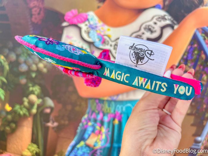 These new ears are beautifully embroidered (they remind us of the similar ones we spotted in the Mexico Pavilion a while back!) in bold colors with a pink and blue striped fabric bow. One side of the headband has the phrase “Magic Awaits You” embroidered on it.
