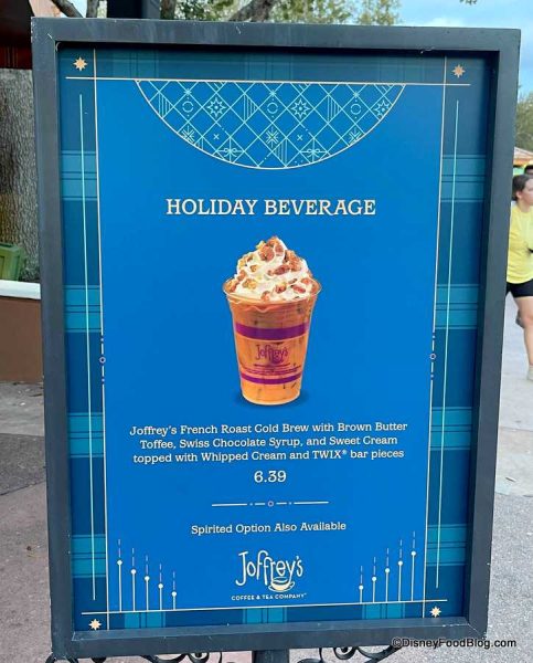 While some festivals offer multiple options at Joffrey’s coffee carts around the park, this year’s Festival of the Holidays is only serving up one special drink, and you can find it at every Joffrey’s stand in EPCOT (although not all of the Joffrey’s carts in EPCOT were open today for the Festival of Holidays). Say hello to the Carolers’ Cold Brew!