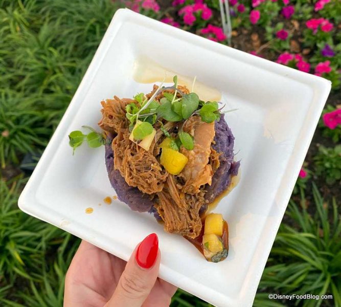 In general, the Mele Kalikimaka booth has some really tasty snacks and refreshing drinks. The flavors you’ll find here aren’t like any of the other booths around EPCOT, so it’s a fun stop if you like to try different kinds of food from around the world. We love the Kalua pork and Haupia, so if you just try a couple of things, we recommend those! And the light flavors make this one of the best choices for a hot day in EPCOT when you don’t really want heavy food or hot drinks.