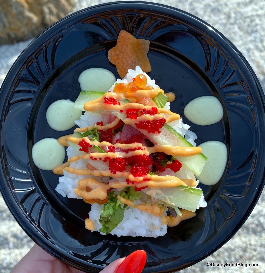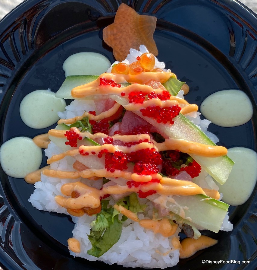 This was a brand new item in 2019 and is just SO festive! It’s a pretty good size dish for the price, but there aren’t really any standout flavors (at least in our experience eating this dish in the past). This is a festival item you could definitely get just to post on Instagram, and there’s nothing wrong with that! When we had it in the past, we felt that it was pretty plain, but it will please classic sushi fans.
