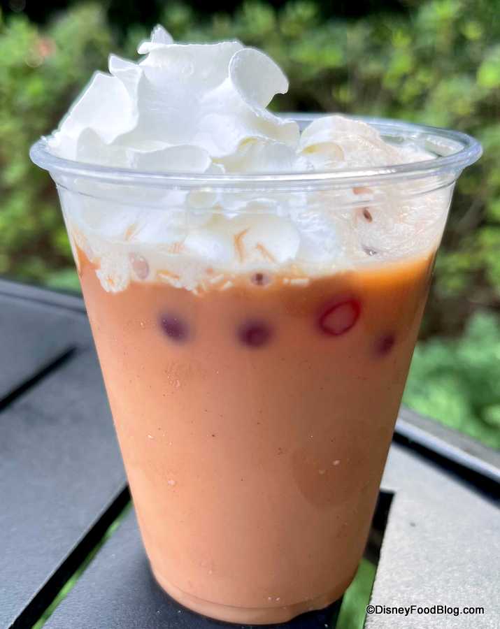 As we mentioned above, ALL of the drinks on this year’s menu are brand new! Let’s check them out. We started with the nonalcoholic Chocolate Banana Boba which is made with cocoa, Calpico (which is a Japanese, somewhat milky drink), banana syrup, and strawberry popping boba pearls. Ours also had some whipped cream on top.