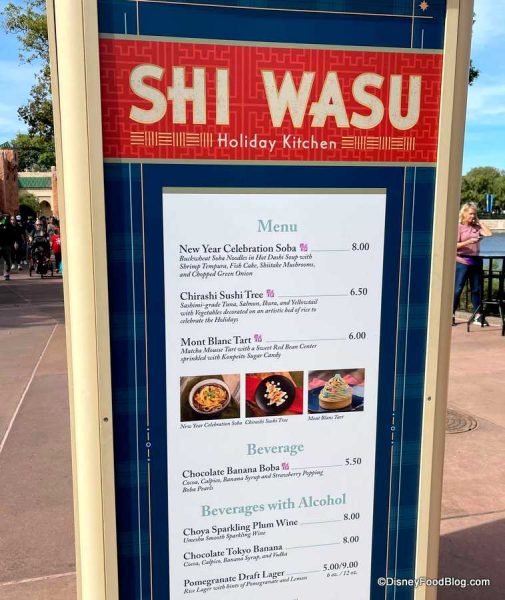 Today, we’ve been making our way around EPCOT for the 2021 EPCOT International Festival of the Holidays. Over in the Japan pavilion, the Shi Wasu Holiday Kitchen booth has some NEW items as well as some returning favorites! Are any of them worth a try? There’s only one way to find out… .