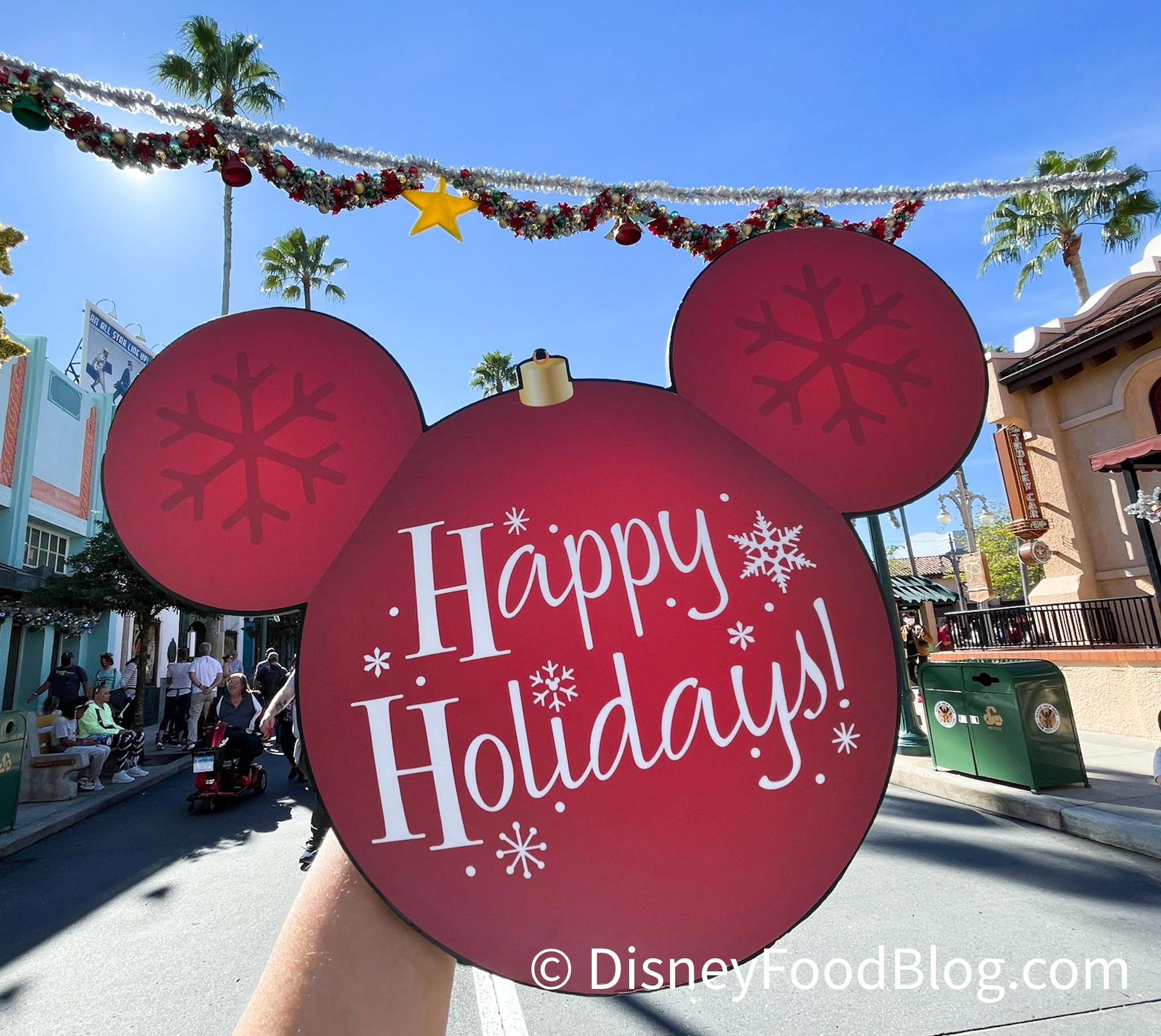 Cast Members were spotted with a festive prop guests can hold in their photos that reads “Happy Holidays.”