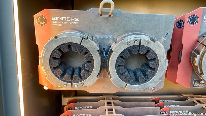 At Galaxy’s Edge, you can find First Order Binders with Light Effects for $19.99, which are…handcuffs? Well, technically they’re First Order handcuffs. So these space handcuffs come with a few special features, like a red light effect when closed, and a green light when open.