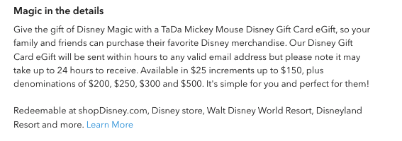 shopDisney notes that their Disney Gift Card eGifts can take up to 24 hours to receive, so perhaps it’s not much of a shock that there would be a bit of delay with these eGift cards when bought in the park, but it can still be surprising for those who are used to using their physical gift cards in the parks immediately.