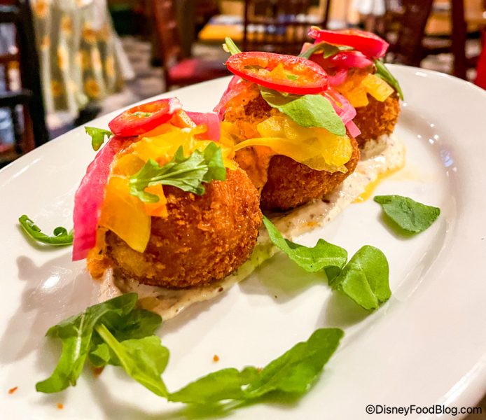 The Boudin Balls are a mix of andouille sausage, smoked sausage, and dirty rice that’s then breaded and fried. They were served with a remoulade, creole mustard, and pickled vegetables.
