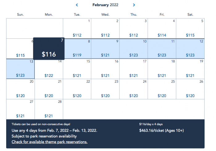 Next, we’ll talk about an important secret to saving some cash on your park tickets! Let’s say you’re planning on visiting Disney World in February and want to visit the parks from February 10th through the 13th. You’ll be buying a 4-day 1-park-per-day ticket for your trip.