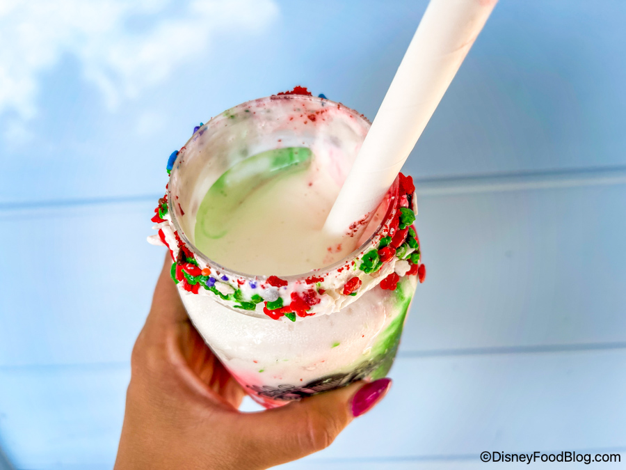 The shake itself tastes almost exactly like the Christmas Cookie Milkshake we tried previously this holiday season in Magic Kingdom, just with the addition of SUPER sweet caramel. Which, speaking of, major snaps to Beaches for seriously bringing it in the colorful (or sparkly!) caramel department. Caramel is good, but GREEN caramel is mega fun.