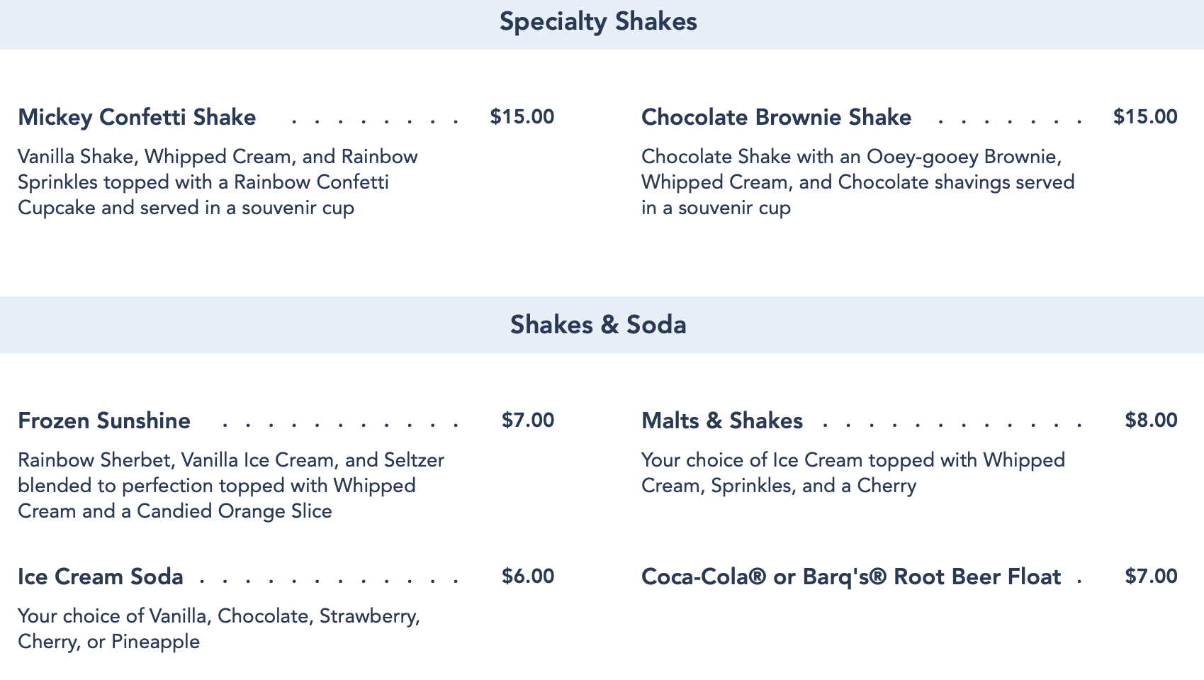 There are also Specialty Shakes, like the Mickey Confetti Shake, and Shakes with Soda, like a Root Beer Float!