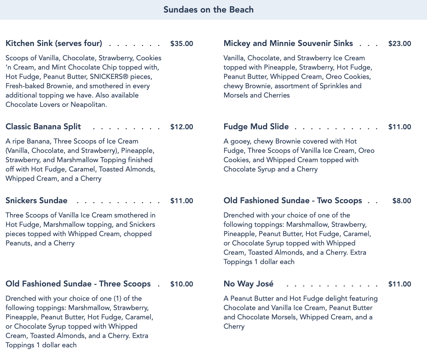 …Beaches and Cream doesn’t have a huge menu right now, but there are some good options! They’re open for lunch and dinner, but both meals have the same menu. For entrees, you can get things like a classic Angus Beef Burger or the Cheddar-Bacon-Ranch Chicken Sandwich. BTW, check the prices. There’s pretty great, right? (Well, OK, by Disney standards, at least!). A fresh-made sandwich or burger for around $15 in Disney World at a sit-down restaurant is a score!