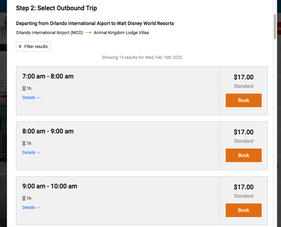 You’ll select an outbound trip. There are a variety of different time slots to pick from.