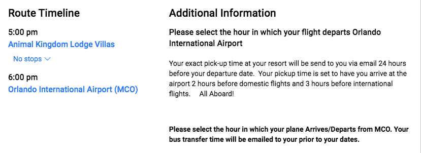 The Mears Connect sites notes that for standard service, the return transportation will be scheduled to meet you at your resort up to 3 hours in advance of your domestic flight’s departure time. You’ll get a confirmation email and 24 hour notification with more details. Express service will be scheduled to meet you at the hotel 2 hours before the departure time for a domestic flight.