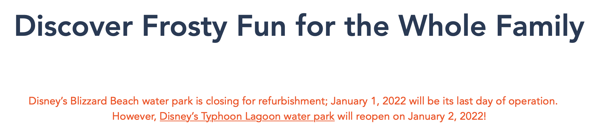 Blizzard Beach will be closing in the new year for refurbishment. Its last day of operation is January 1st, 2022.
