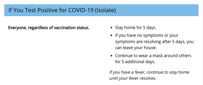 The CDC has also indicated that individuals who are experiencing symptoms can leave isolation after 5 days if their symptoms are “resolving.” If an individual has a fever, the CDC recommends that the individual continue to stay home until that fever is resolved.