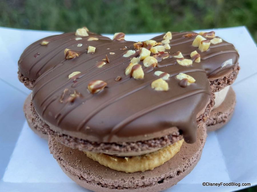- SNICKERS Caramel-Peanut Milk Chocolate Mickey Macaron: Chocolate Mickey macaron filled with caramel ganache and SNICKERS pieces (available with Sip & Savor Pass) — $6.50