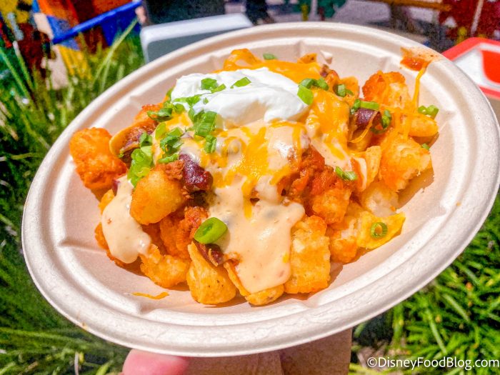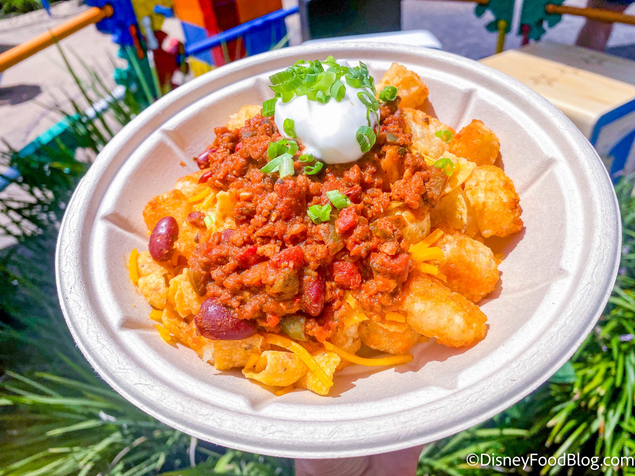 It should come as zero surprise that the Totchos at Woody’s Lunch Box in Disney’s Hollywood Springs are among our FAVORITE snacks in the parks. It’s a crispy-crunchy-ooey-gooey mix of tater tots (or potato barrels), beef and bean chili, shredded cheese, queso, tomatoes, corn chips, sour cream, and onions. ‘Nuff said!