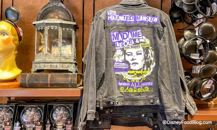 The Tower Hotel Gifts shop has this new Haunted Mansion jean jacket featuring miss Madame Leota. Hey, Leota, shouldn’t you be over in Liberty Square?