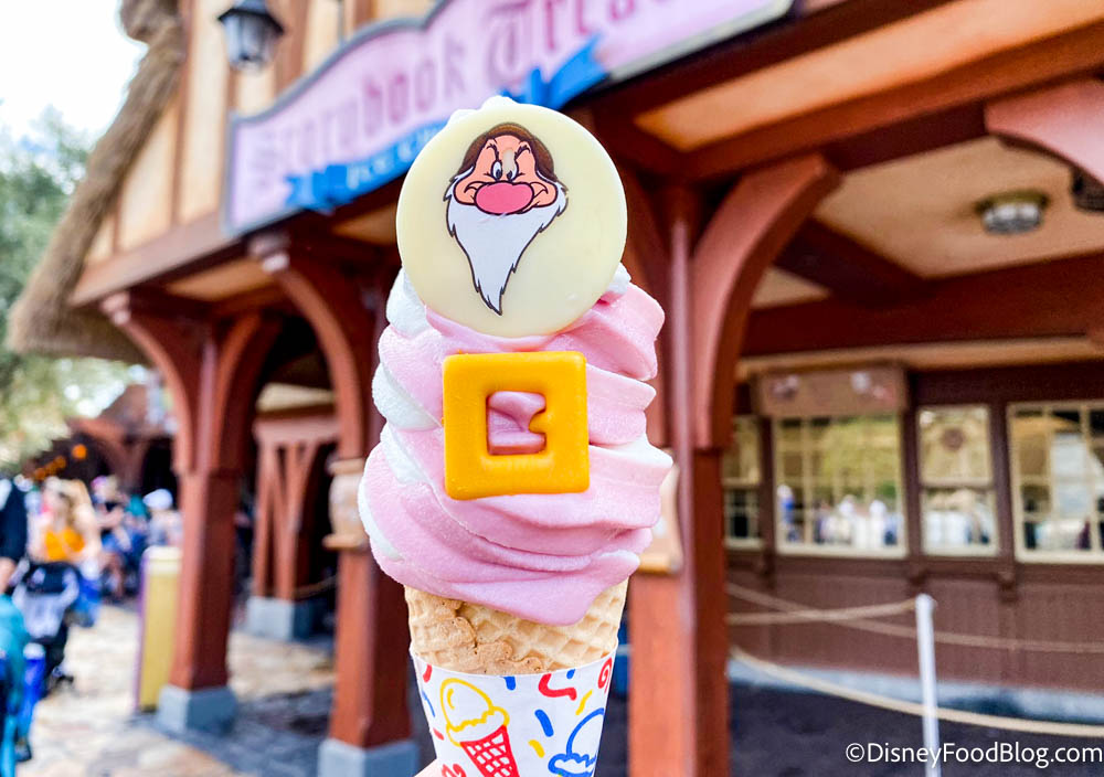 Remember the Seven Dwarfs Specialty Cone over at Storybook Treats in Fantasyland? When it debuted back in November, it was cranberry-vanilla soft-serve ice cream in a cone, decorated with a chocolate belt buckle and a white chocolate face of Grumpy.